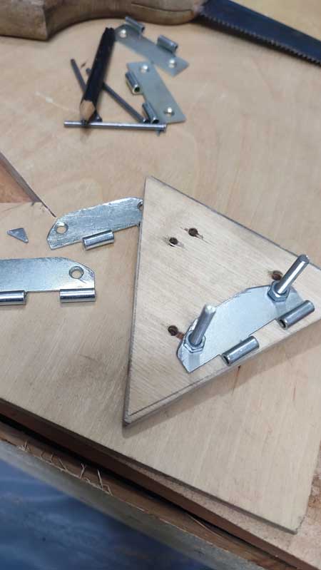 حالا موقع نصب لولا ها روی صفحه مثلثی بود. وقتی لولا ها رو گذاشتم روی صفحه که جای سوراخ ها رو در بیارم. طول هر لولا 5 سانتی متر بود و هرکدوم رو درست وسط یک ضلع مثلث گذاشتم. مشکلی که بود این بود که گوشه ی لولا ها میفتاد روی هم. شروع کردم با اره آهن بر گوشه لولا ها رو بریدم . مرحله بعدی تیزی محل های برش رو با سوهان ساییدم و از بین بردم. حالا که لولا ها رو گذاشتم روی صفحه دیگه گوشه ها روی هم نمی افتاد.