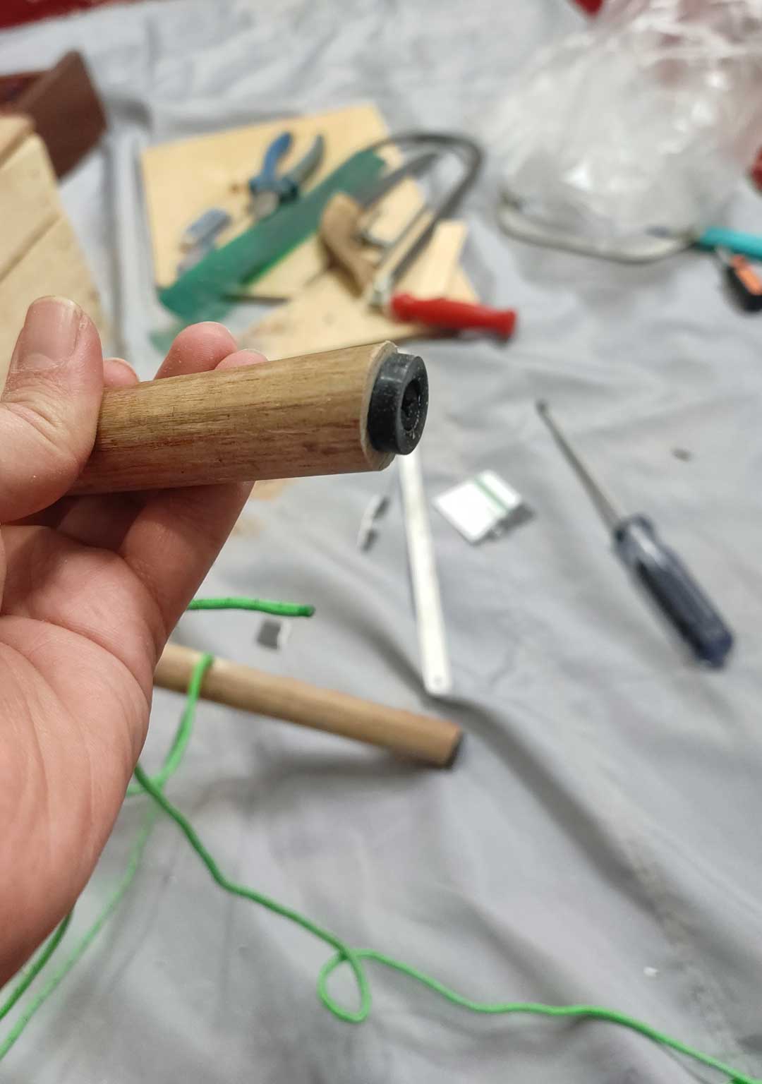 مساله بعدی این بود که پایه ها کاملا آزاد بودن و هیچ محدود کننده ای نداشتن. این باعث میشد که احتمال وا رفتن پایه ها و زمین خوردن سه پایه خیلی زیاد بشه. اومدم پایه ها رو به فاصله 25 سانتی متر از بالاشون سوراخ کردم و یه طناب که حالت کشسانی نداشته باشه ازشون رد کردم . پایه ها رو تویه زاویه مناسب ثابت کردم و طناب رو با گره زدن در هر طرف سوراخ ها ثابت کردم. اینجوری پایه ها نمیتونن آزادانه روی طناب حرکت کنن . هر بار که سه پایه رو باز میکنم تو اندازه و زاویه از پیش تعیین شده تنظیم میشه.
